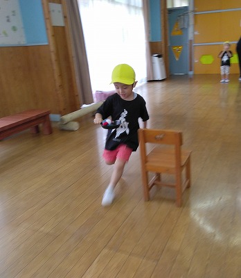 玩具のフライパンやおたまに、ボールやお手玉を乗せて運ぶ競争です。 落ちないように手元をみながら、スピードアップ!! 次の人に渡すときは、「ハイ!」と声をかけて息を合わせていました。