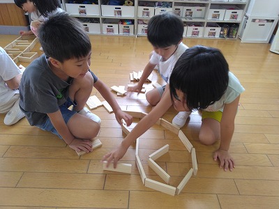 友達と一緒に、長くしたり、積んだり…。何をつくるのか、どんな形にするか、どうしたら倒れないでできるかを考え、慎重に重ねています。