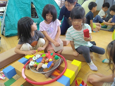 大型ブロックやフープを使ってバーベキューに見立てています。網も敷いて、本物そっくり!