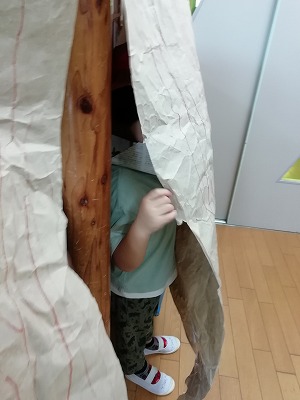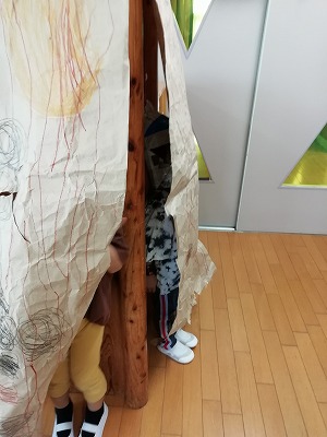 園に来る荷物に入っていた緩衝用の紙がとても長かったので、クレヨンで木の模様を描き、部屋の柱につけて隠れ場所を作りました。