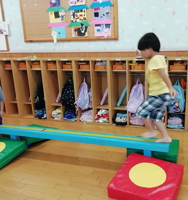 平均台を橋に見立て、バランスを取りながら慎重に、かつ、素早く歩きます。 他にもいろいろな用具を組み合わせて修行の場を作り、忍者ごっこに夢中です。