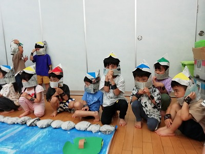 別の日には、この様子を見ていた3歳児クラスの子ども達が「修行したい!」とやってきました。 新聞紙や画用紙で作った頭巾や手甲を身に着けた忍者達(4歳児クラスの子ども達)は、新米忍者(3歳児クラスの子ども達)の修行を見守り、「がんばれー!」と応援しています。