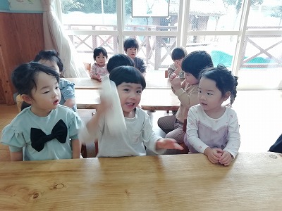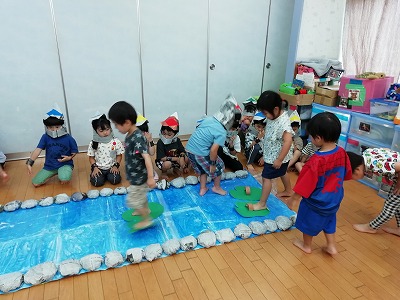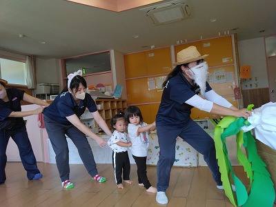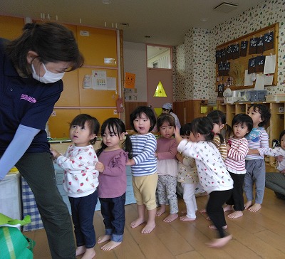 「もう一回やろう!!」、子ども達のリクエストに、保育者は張り切ってもう一度。
