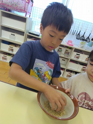最後は、すり鉢を使って、もみすりです。フーッと息をかけて、もみ殻を飛ばしました。 お米(白米)になる行程を聞き、自分達でも調べ、実際に触れ、道具を使って白米にするという貴重な体験ができました。