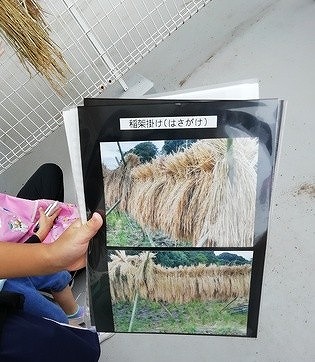 まずは、稲を稲架(はぜ)にかけて天日で乾燥(はぜかけ)させた後、脱穀し、もみすりをして玄米にし、精米して白米にする工程を教えてもらって…。