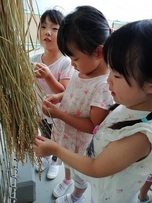 稲に触ったり、匂いを嗅いだりしています。柏鳳保育園のまわりには水田がたくさんありますが、近くで見るのは初めてというお子さんもいました。米とぎで見ていた、白米との違いをよく観察していました。