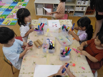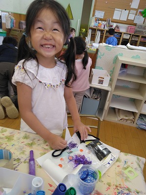 登園すると、「何をつくろうかな?」とコーナーに集まり、材料を選んで、工作が始まります。