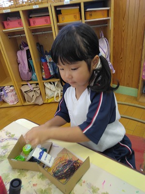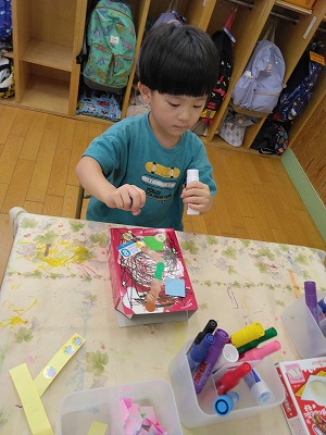 こちらでは、箱にいろいろなものをつけています。 「何かなぁ?」と保育者がのぞくと、ペットボトルのフタをつけたこと、ヒモをつけたことを説明してくれました。つなげて…、くっつけて…。