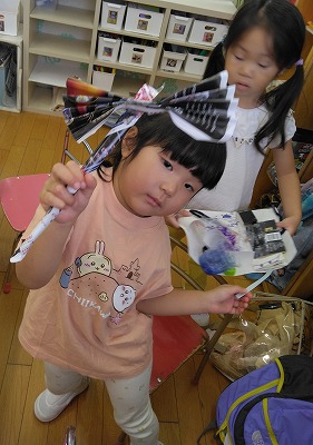 広告紙も魔法のステッキに!! 魔法使いになりきって遊んでいました。