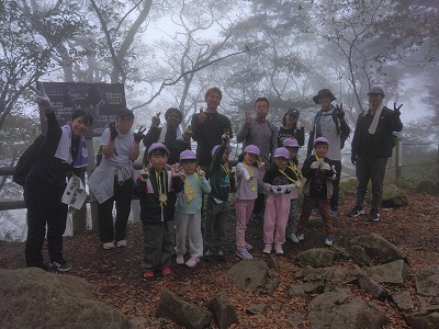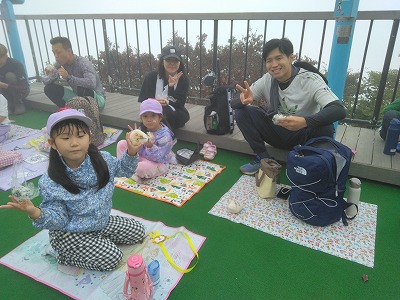 頂上の展望台でおにぎりを食べました。 まわりは霧で真っ白でしたが、それもまた、なかなか見ることのできない経験でした。
