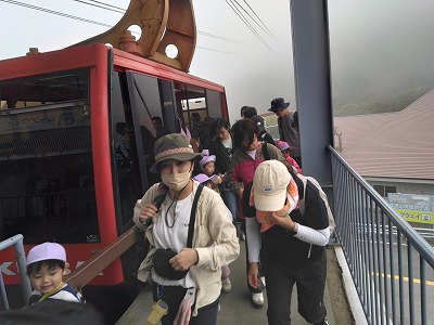 帰りはロープウェイで下山。 霧一面の景色からだんだんと緑が見えてきて、景色が変わっていく様子もしっかり観察しました。帰りのバスの中は、みんな、ぐっすり夢の中でした。