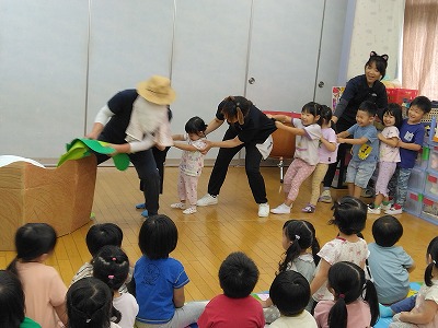 保育者が扮するおじいさんの語りに合わせて、誕生月の子ども達もイヌやネコになってカブを引っ張ります。みんなで力を合わせてカブが抜けると、見ていた子ども達も「やったー!!」「大きいね~」と大喜び!