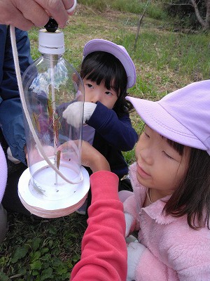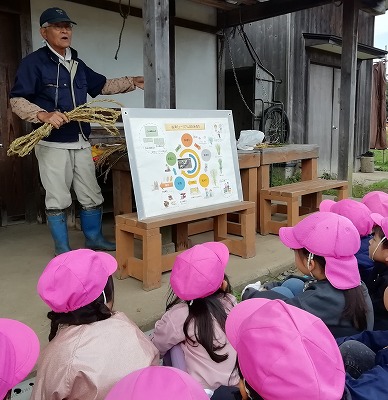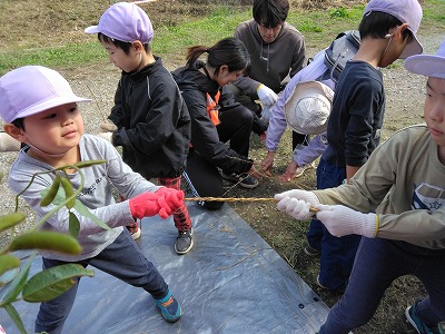4、5歳児クラスの子ども達は、谷津ミュージアムへ行きました。自然観察員の方と長寿大学の方たちから、我孫子の自然を教わり、ミュージアムで収穫した稲のワラを使って、縄作りの体験もしました。