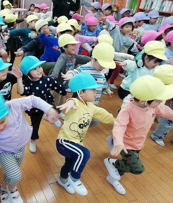 ハッスルタイム初日は、2歳児から5歳児クラスの子ども達が集まり、うんどうマンをまねて、様々な動きに挑戦した体幹運動をしました。