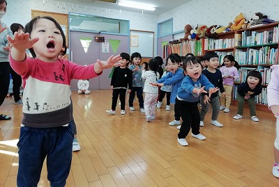体操『昆虫太極拳』が今、大人気の2歳児クラスの子ども達は、指先まで昆虫になりきって力が入っています。