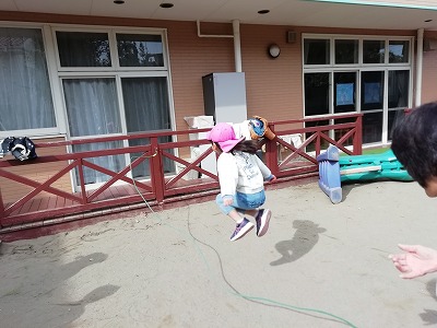 4歳児クラスの子ども達は、「イーチ、ニーイ、走って、ジャンプ」のかけ声で、長縄跳びに挑戦です。縄をまたぐことから始めた長縄跳びも、今ではタイミングよく縄に入り、両足で高くジャンプして跳んでいます。