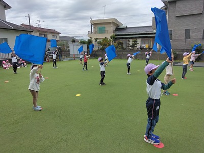 見どころは、フラッグの演技を終えて5歳児クラスの子ども達が「みんな~、おいで!」と全園児に呼びかけるところ。そして、『一笑懸命』という曲をみんなで踊ります。「ワハハハ〜」とみんなで笑うフレーズが子ども達も保育者も大好きです。