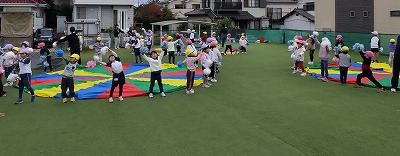 パラバルーンは、3、4、5歳児クラスの子ども達が一緒のチームになり、曲に合わせていろいろな形を作ります。曲の最初にダンスもします。3歳児クラスの子ども達は、お兄さん、お姉さんを真似て、パラバルーンの形やダンスを練習しています。