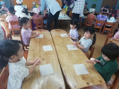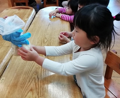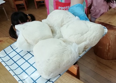 次の日、ふくらんだ生地をみて「大きくなった~」「すごい!」と驚いていました。一人ずつに切り分けて形作りをしました。丸めたり、長細くしたり、思い思いの形にしています。