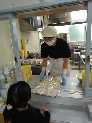 3歳児クラスの子どもたちが調理室へ持っていき、「焼いてください」。「上手にできたね。おいしそう」と調理室の職員に言われると、「ウサギにしたの」「キラキラ、いっぱいのせたよ」と、子どもたちの話が止まりません。