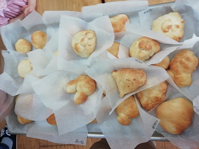 お皿にのせて、この笑顔!! まずパンだけを食べて「おいしい!」。バターをつけて、「おいしい!」。「また、やりたい!!」「今度は、〇〇の形のパンを作る」とあちらこちらから、作りたいパンの話が聞こえてきました。